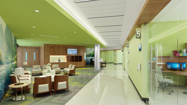 我們圍繞造價邏輯和體驗這一要素,借鑒美式醫(yī)療設(shè)計表現(xiàn)手法,結(jié)合空間概念、色彩概念和導(dǎo)視概念,在形成醫(yī)護康養(yǎng)的功能業(yè)態(tài)閉環(huán)之外,表現(xiàn)山水田園的意趣。
