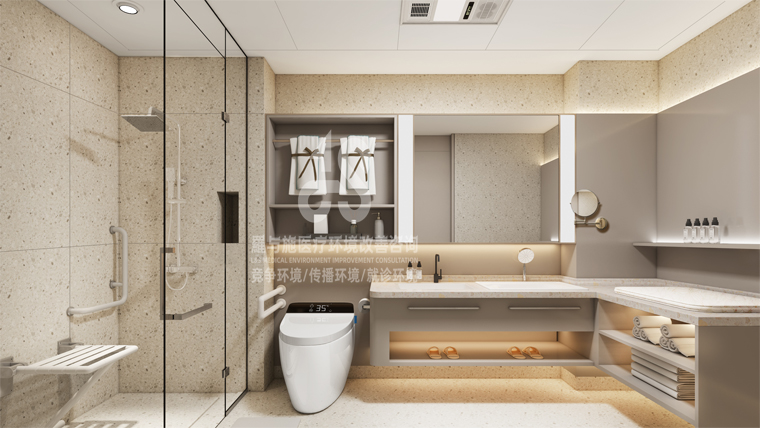 衛(wèi)生間智能馬桶、呼叫鈴、防滑凳防跌扶手一應(yīng)俱全。