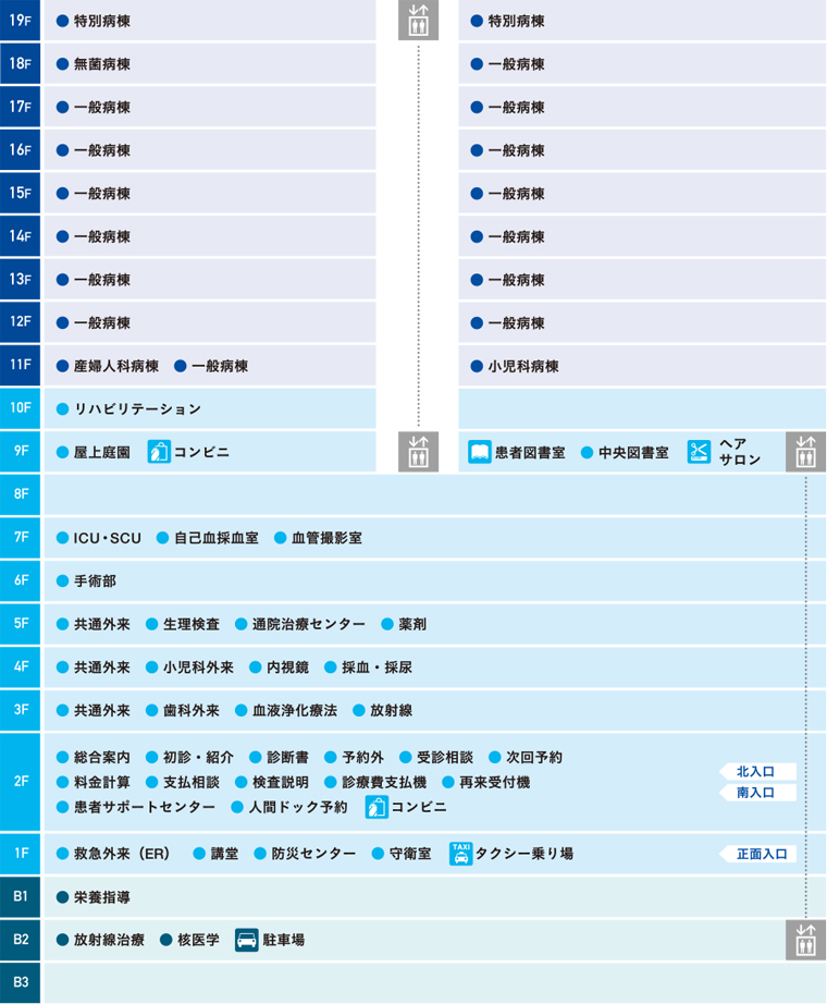 這棟醫(yī)療建筑高度近百米,地上19層,地下3層,開設(shè)了38個臨床科室,開放819張病床,約2000名工作人員為用戶提供高級醫(yī)療服務(wù)。