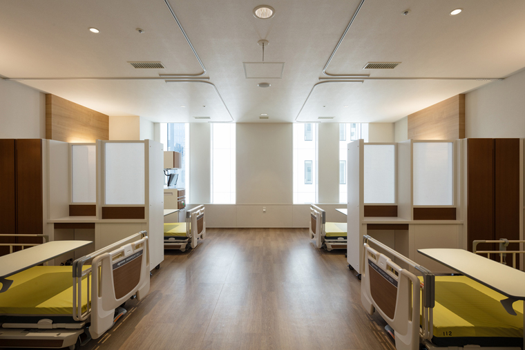 像4人間病房這里,相鄰病床利用邊柜作為隔斷,創(chuàng)造了隱私空間。