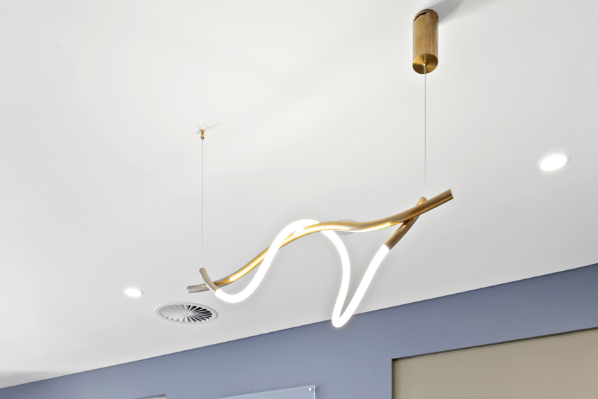 像護(hù)士站這里,就集齊了藝術(shù)燈具、布藝沙發(fā)椅、掛畫、綠植四大元素。