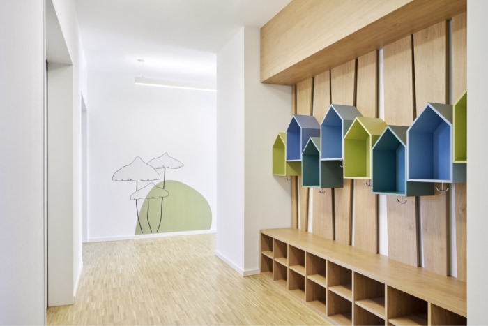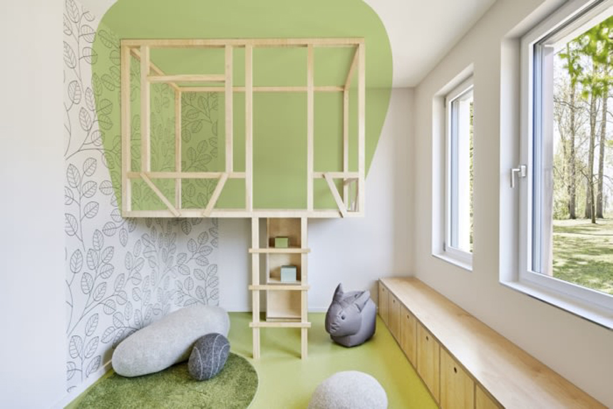 綠野森林是 6 至 12 歲孩童的主要活動區(qū)域。大廳的互動裝置是一棵可供攀爬樹屋,促進(jìn)孩子們展開活動。