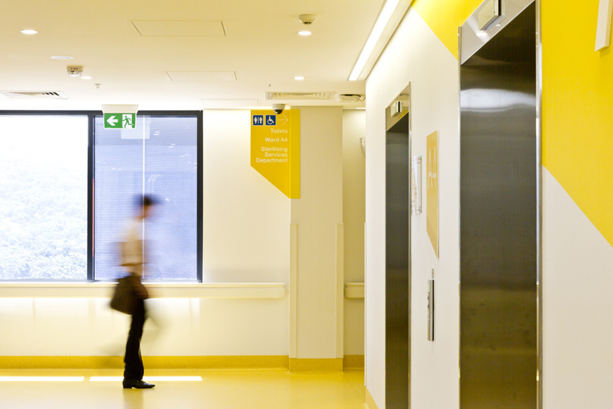 醫(yī)院每個樓層的導視標牌,都應用了這種結(jié)合色彩、圖形和數(shù)字的表現(xiàn)方法。