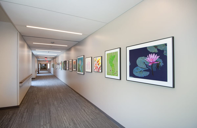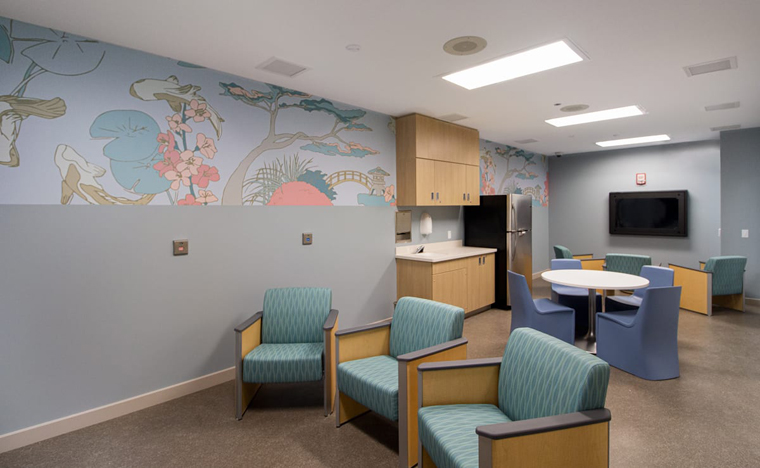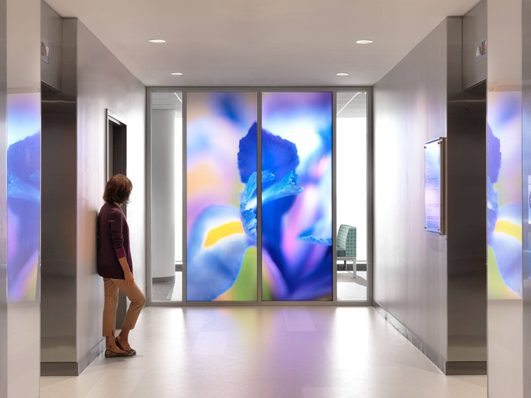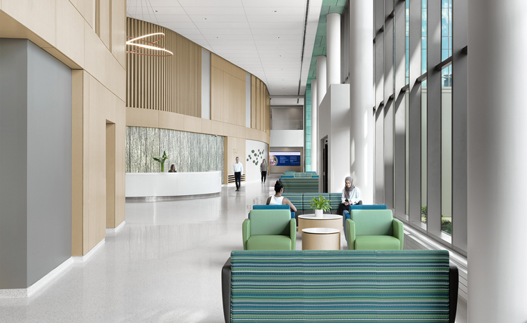 就醫(yī)院內(nèi)部環(huán)境而言,在采光、視野之外,醫(yī)療軟裝也是空間療愈力的重要構(gòu)成。在200000 平方英尺(約18581㎡)的門診護(hù)理中心,能捕捉到很多細(xì)節(jié)體驗(yàn)。