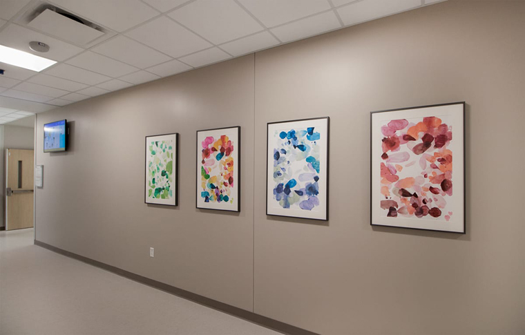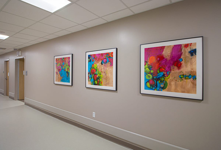 秘訣就是,掛畫和醫(yī)療家具進(jìn)行色彩呼應(yīng),既能塑造豐富體驗(yàn),又保持空間整體統(tǒng)一。