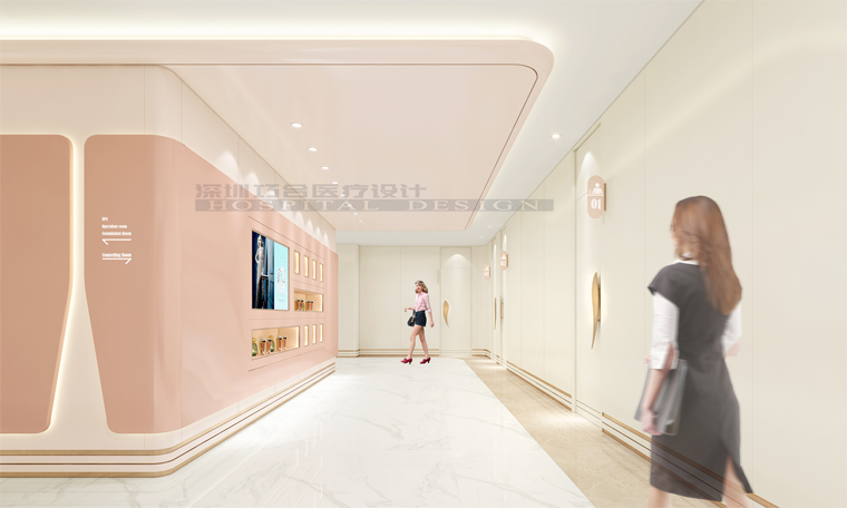 在空間色調(diào)方案之后,是通過設(shè)計(jì)環(huán)境圖形來營造情境。深圳幽簾生命科學(xué)的設(shè)計(jì)方案選取了3個(gè)情境,分別是芭蕾舞鞋綁帶、蕾絲花邊、微風(fēng)吹起裙角,并從中擷取元素進(jìn)行環(huán)境圖形創(chuàng)作,運(yùn)用在接待臺(tái)形象墻或過道墻體的裝飾板,勾勒出優(yōu)雅克制、美是朦朧等意境,喚起女性群體的情感共鳴。