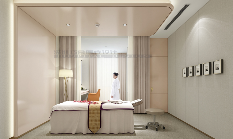 設(shè)計(jì)方案給出的解決辦法是,基于“造價(jià)等級(jí)區(qū)分”原則來達(dá)成設(shè)計(jì)效果和成本控制的平衡。例如,VIP咨詢室環(huán)境設(shè)計(jì)的重點(diǎn)是強(qiáng)調(diào)專業(yè)氛圍和技術(shù)權(quán)威,同時(shí)創(chuàng)造宜人的溝通環(huán)境,因而使用了比較多的軟裝元素。而spa室在空間面積有限的前提下要呈現(xiàn)安靜和私密氛圍,就必須擯除過多裝飾。在柔和的空間色調(diào)中,多層次輔助照明映射出這個(gè)空間的舒適感,營造出沉浸式spa環(huán)境氛圍。