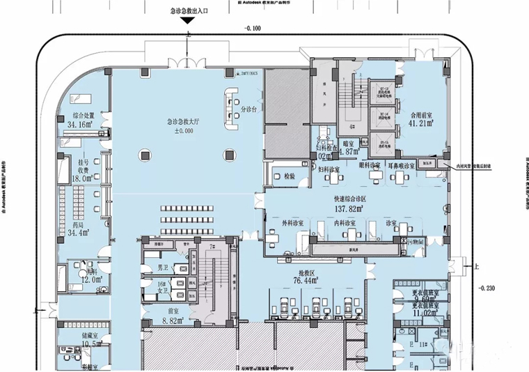 具體來說,急診大廳應(yīng)單獨設(shè)置出入口,方便急救車、擔(dān)架車、輪椅車停放。大廳布局要緊湊、集中,可單獨設(shè)置掛號、藥局、檢驗服務(wù)窗口,各功能區(qū)域之間動線設(shè)置不宜過長。當(dāng)急診大廳兼用分診功能時,面積不得小于24.00㎡。