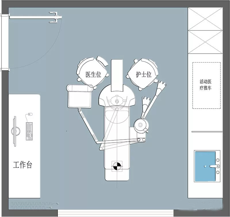 不同科室的診室,平面布局有所不同。比如婦科診室檢查項(xiàng)目較多,面積設(shè)置應(yīng)不小于15㎡,還要做好潔污分區(qū)。而口腔診室的平面布局,要注意滿足這一空間感染控制的需求。每椅中距應(yīng)不小于1.8米,椅中心距墻應(yīng)不小于1.2米。對(duì)于隔斷診間,注意每個(gè)隔斷區(qū)均應(yīng)配備水池。